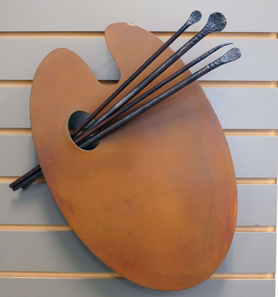 Instantly recognizable, but far from ordinary—this steel Paint Palette Wall Hanging celebrates the creative spirit in solid form. Fabricated from 16-gauge steel and featuring four hand-forged brushes welded in place, it’s a sculptural tribute to the artist’s process.