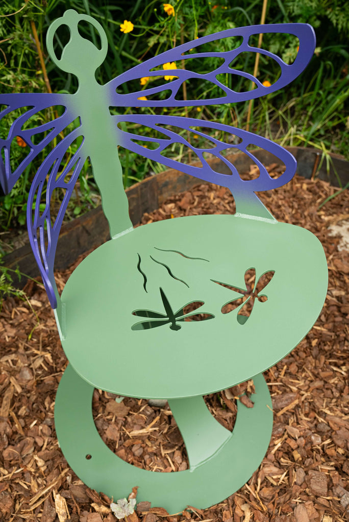 Hand-forged in Durham, NC, this chair brings the grace of the dragonfly and the grit of true craftsmanship to gardens, patios, and quiet corners.