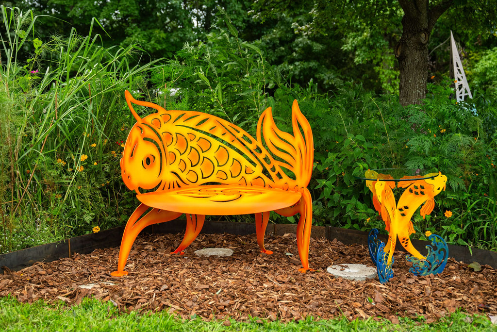 Set beneath a sturdy glass surface, the leaping koi base brings energy, movement, and meaning to any space—indoors or out.