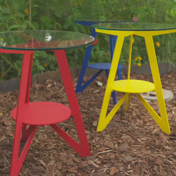 With bold geometry, vivid pop colors, and a timeless silhouette, the Acute Angles Table is a striking accent for entryways, living rooms, patios, or garden corners. Hand-forged from steel, it features a handy lower center shelf, and is topped with 3/8" thick clear glass.