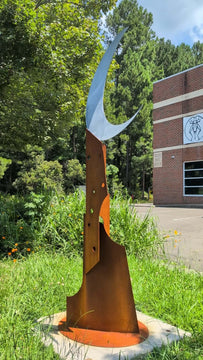 One of our newest freestanding sculptures, The Moon and Spoon brings the night sky down to ground level. Hole patterns reference the Big and Little Dipper constellations—long known as the “big and little spoons”—while the oxidized steel body and flame-sprayed zinc moon are built to weather beautifully over time.